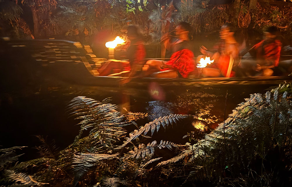 Lousy photo of some Maori paddling a waka down a fake river. Why were they paddling so fast? They were trying to escape a Lord of the Rings Film Location.