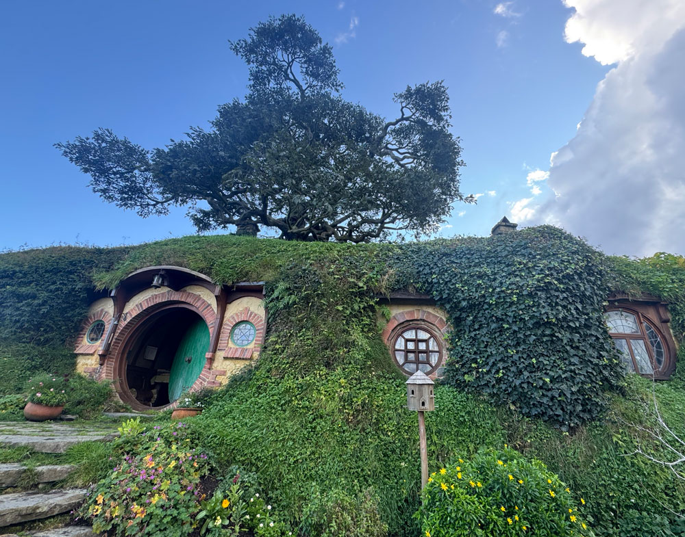 The oak tree above Bag End is actually fake! Apparently the original died between Lord of the Rings and The Hobbit, so Peter Jackson had it recreated out of fiberglass, using silk for the leaves and wiring them to the branches. Love it!